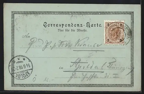 alte Ansichtskarte, gelaufen 1898, leichte Bugspur re. oben, guter Zustand