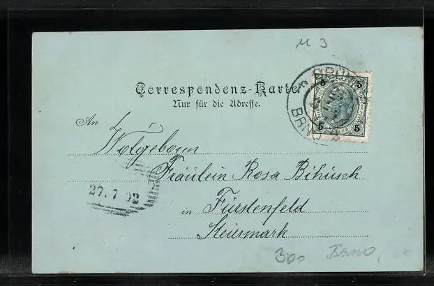 Personenbezogene Daten auf der Rückseite der Karte wurden durch blauen Textmarker unkenntlich gemacht. Die blauen Stellen sind auf die Vorderseite durchgeweicht und wirken sich negativ auf das Postkartenfoto aus