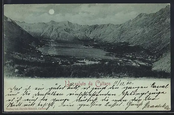 Mondschein-AK Cattaro, Gesamtansicht mit Gewässer und Bergpanorama