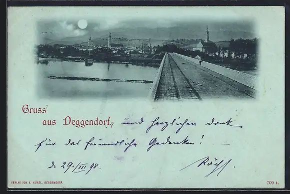Mondschein-AK Deggendorf, Totalansicht von der Brücke aus