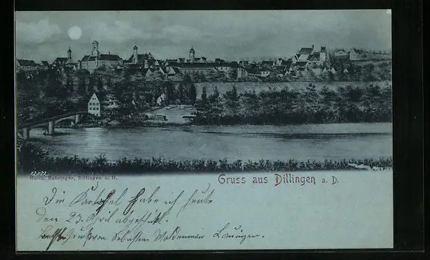 Mondschein-AK Dillingen a. D., Ortsansicht bei Vollmond