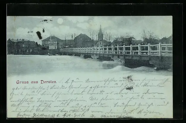 Mondschein-AK Dorsten, Stadtansicht mit Brücke