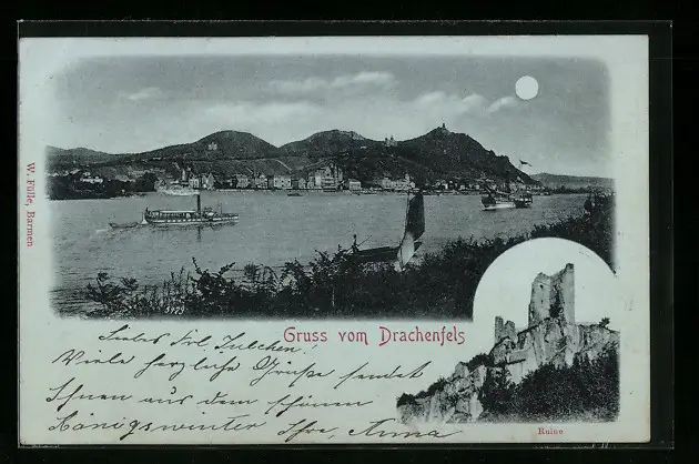 Mondschein-AK Drachenfels, Dampschiff auf dem Fluss, Burgruine