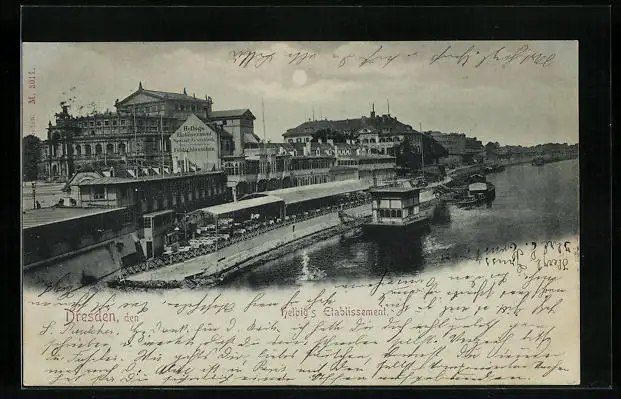 Mondschein-AK Dresden, Helbigs Etablissement am Elbufer