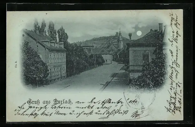 Mondschein-AK Durlach, Blick zum Turmberg