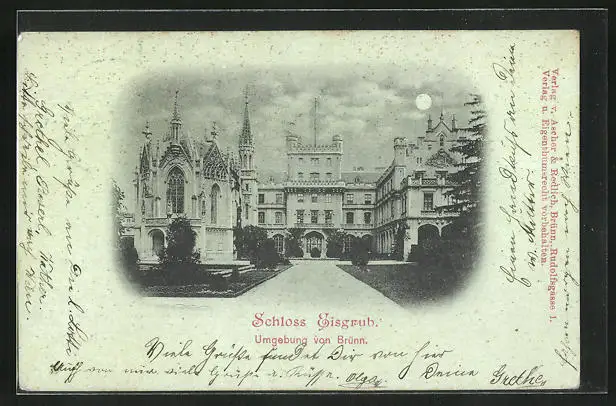 Mondschein-AK Eisgrub, Schloss Eisgrub mit Kapelle