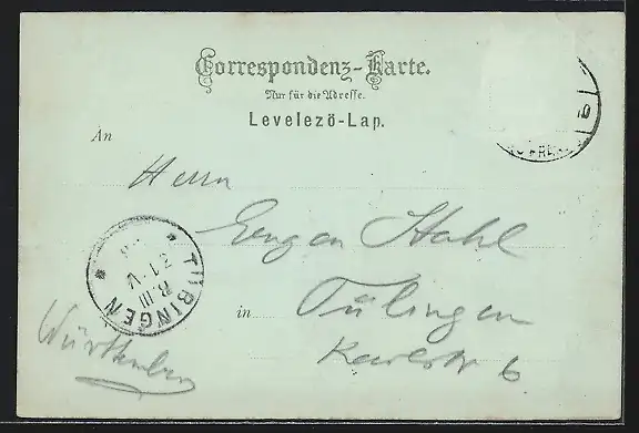 Personenbezogene Daten auf der Rückseite der Karte wurden durch blauen Textmarker unkenntlich gemacht. Die blauen Stellen sind auf die Vorderseite durchgeweicht und wirken sich negativ auf das Postkartenfoto aus