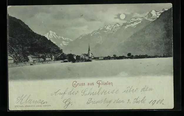 Mondschein-AK Flüelen, Blick zur Kirche im Ort