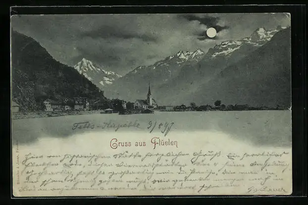 Mondschein-AK Flüelen, Uferpartie mit Kirche