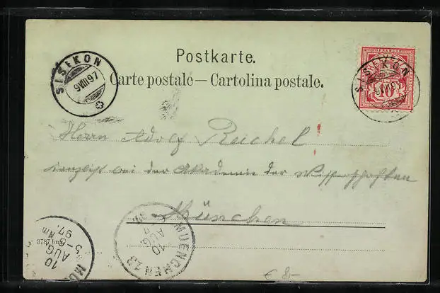 alte Ansichtskarte, gelaufen 1897, Eckknicke li. unten u. re., minimaler Einriss re. mittig, guter Zustand