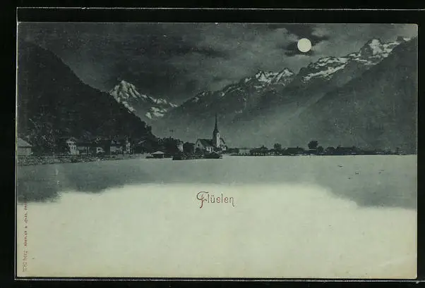 Mondschein-AK Flüelen, Uferpartie mit Kirche
