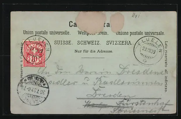 gelaufen 1899, rückseitig Klebe- und Papierreste, guter Zustand