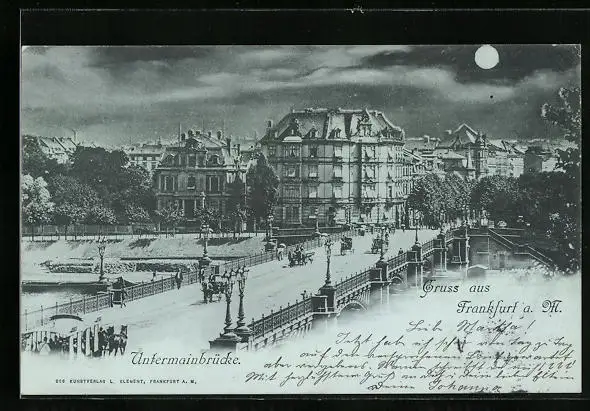 Mondschein-AK Frankfurt /Main, Pferdekutschen auf der Untermainbrücke