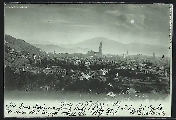 Mondschein-AK Freiburg i. B., Teilansicht mit Kirche