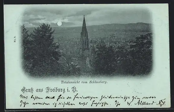 Mondschein-AK Freiburg i. B., Totalansicht mit Münster vom Schlossberg aus