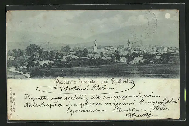 Mondschein-AK Frenstát p. R., Panorama mit Kirche