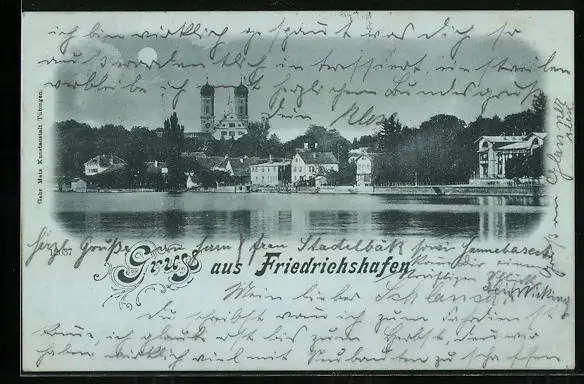 Mondschein-AK Friedrichshafen, Uferpartie mit Kirche