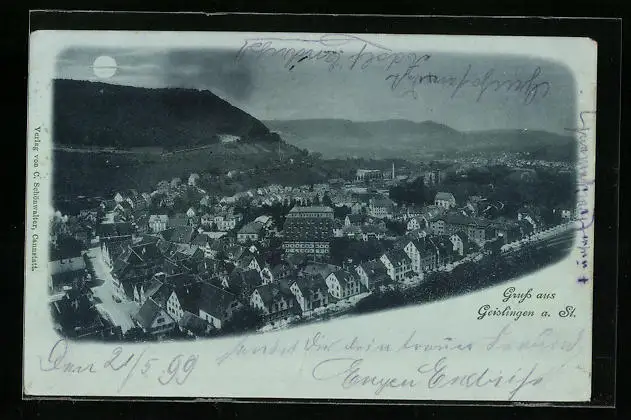 Mondschein-AK Geislingen a. St., Ortsansicht aus der Vogelschau