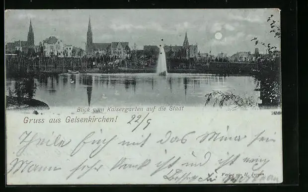 Mondschein-AK Gelsenkirchen, Blick vom Kaisergarten auf die Stadt