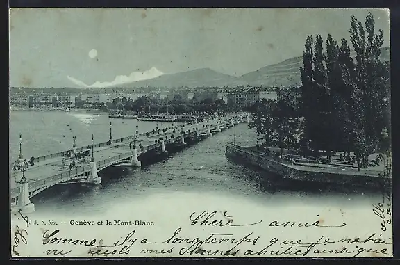 Mondschein-AK Genève, Stadtpanorama mit dem Mont-Blanc