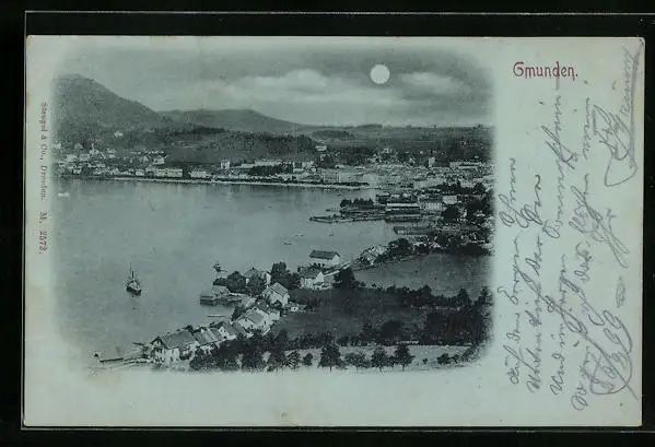 Mondschein-AK Gmunden, Teilansicht aus der Vogelschau
