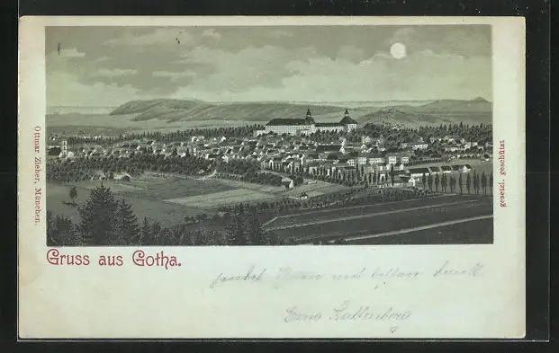 Mondschein-AK Gotha, Panoramaansicht der Stadt
