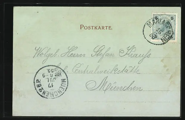 Personenbezogene Daten auf der Rückseite der Karte wurden durch blauen Textmarker unkenntlich gemacht. Die blauen Stellen sind auf die Vorderseite durchgeweicht und wirken sich negativ auf das Postkartenfoto aus
