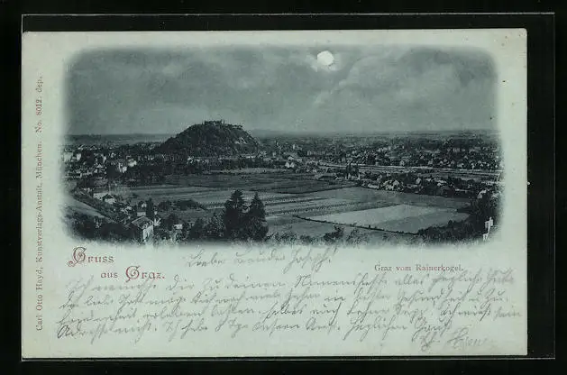 Mondschein-AK Graz, Ortsansicht vom Rainerkogel