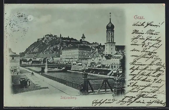 Mondschein-AK Graz, Schlossberg mit Brücke