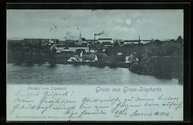 Mondschein-AK Gross-Siegharts, Ansicht vom Sägeteich