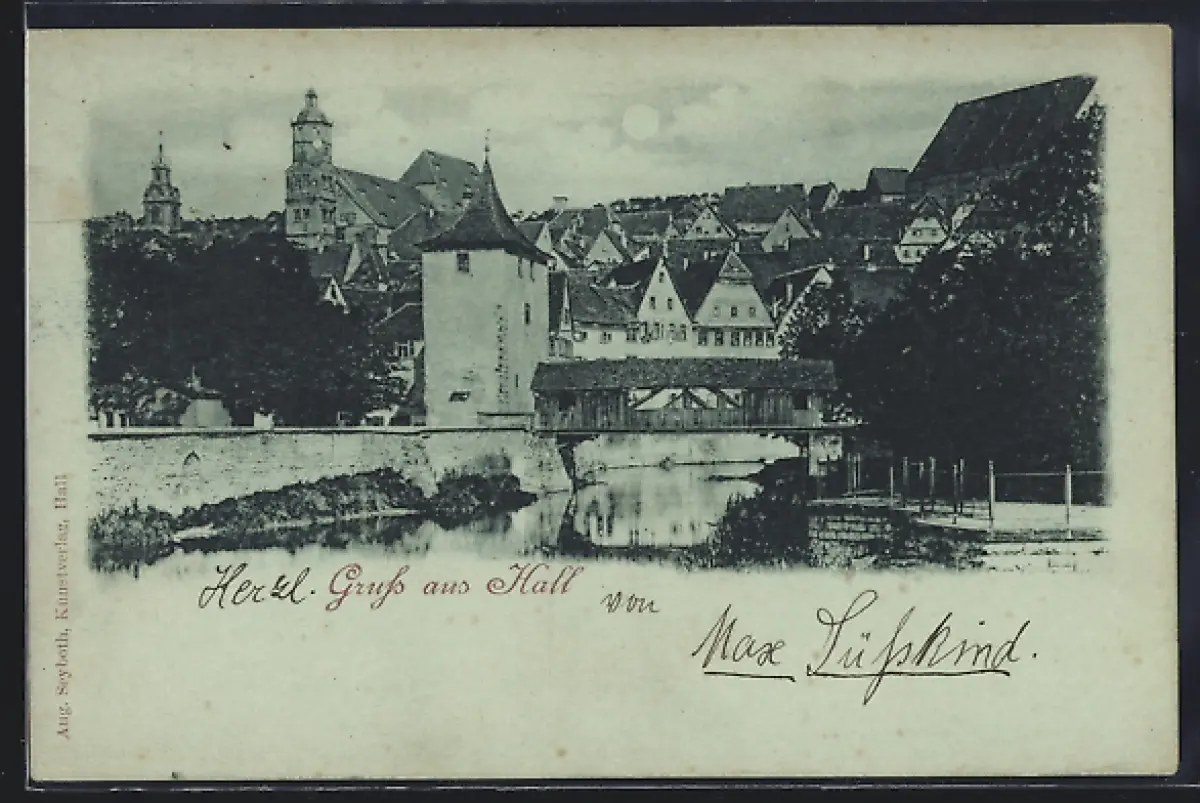 Mondschein-AK Hall, Stadtansicht mit Brücke