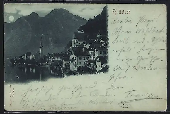 Mondschein-AK Hallstatt, Teilansicht mit Kirche