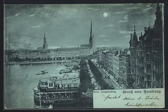 Mondschein-AK Hamburg, Alter Jungfernsteig bei Nacht