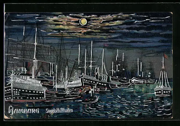 Mondschein-AK Hamburg, Segelschiffhafen mit Schiffen