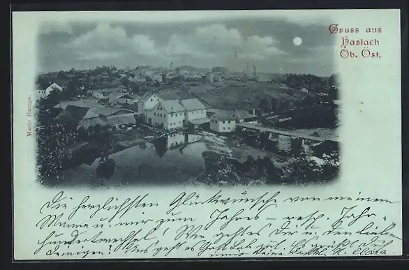 Mondschein-AK Haslach /O.-Öst., Totalansicht mit Brücke aus der Vogelschau