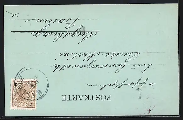 Personenbezogene Daten auf der Rückseite der Karte wurden durch blauen Textmarker unkenntlich gemacht. Die blauen Stellen sind auf die Vorderseite durchgeweicht und wirken sich negativ auf das Postkartenfoto aus