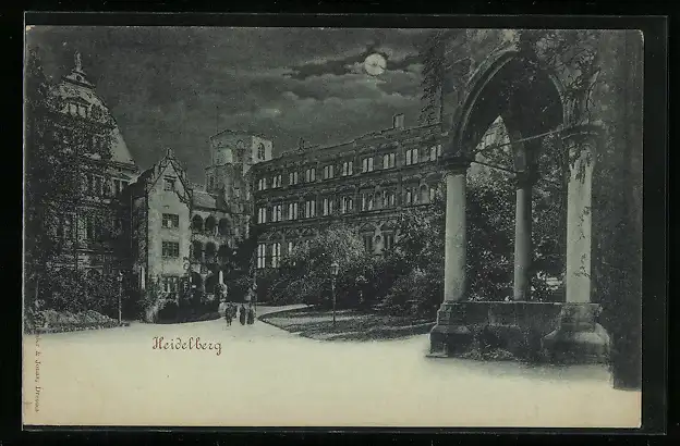Mondschein-AK Heidelberg, Blick zum Schloss