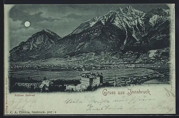 Mondschein-AK Innsbruck, Blick auf Schloss Ambras
