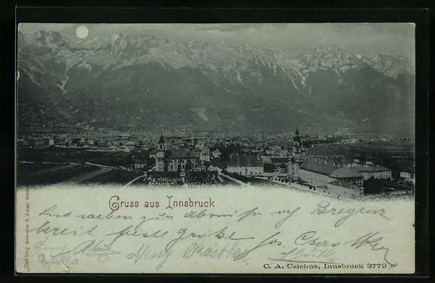 Mondschein-AK Innsbruck, Totalansicht mit Bergpanorama