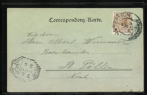 Personenbezogene Daten auf der Rückseite der Karte wurden durch blauen Textmarker unkenntlich gemacht. Die blauen Stellen sind auf die Vorderseite durchgeweicht und wirken sich negativ auf das Postkartenfoto aus