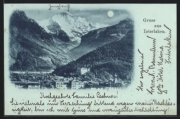Mondschein-AK Interlaken, Ortsansicht mit Jungfrau