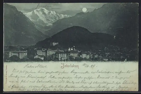 Mondschein-AK Interlaken, Stadtansicht mit Bergpanorama
