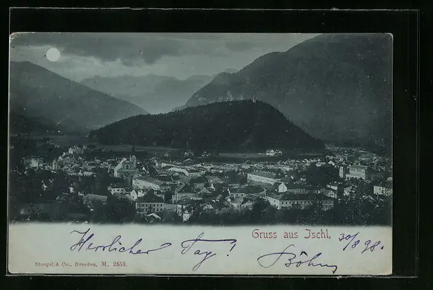 Mondschein-AK Ischl, Totalansicht aus der Vogelschau