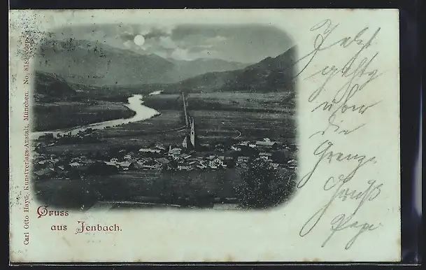 Mondschein-AK Jenbach, Teilansicht mit Kirche