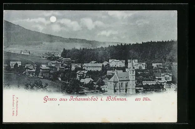 Mondschein-AK Johannisbad, Totalansicht im Mondlicht