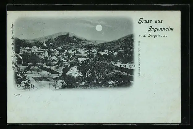 Mondschein-AK Jugenheim a. d. Bergstrasse, Totalansicht aus der Vogelschau