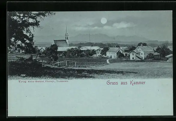 Mondschein-AK Kammer, Ortsansicht mit Kirche