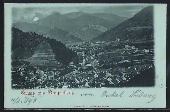 Mondschein-AK Kapfenberg, Teilansicht mit Bergen