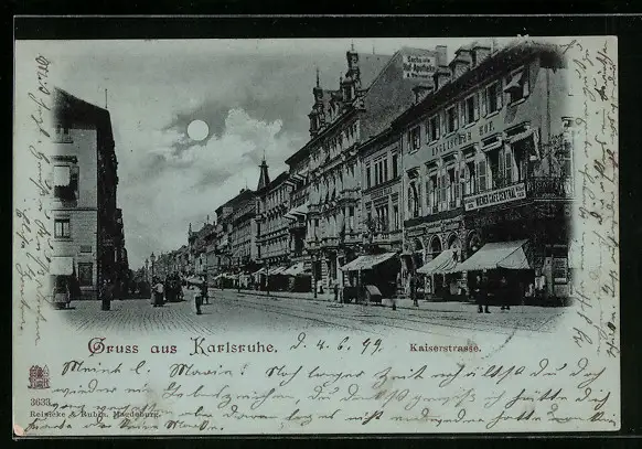 Mondschein-AK Karlsruhe, Blick in die Kaiserstrasse