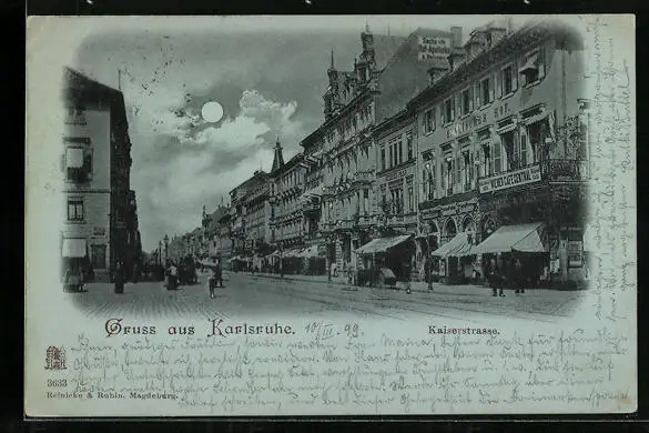 Mondschein-AK Karlsruhe, Kaiserstrasse mit Wiener Cafe Central
